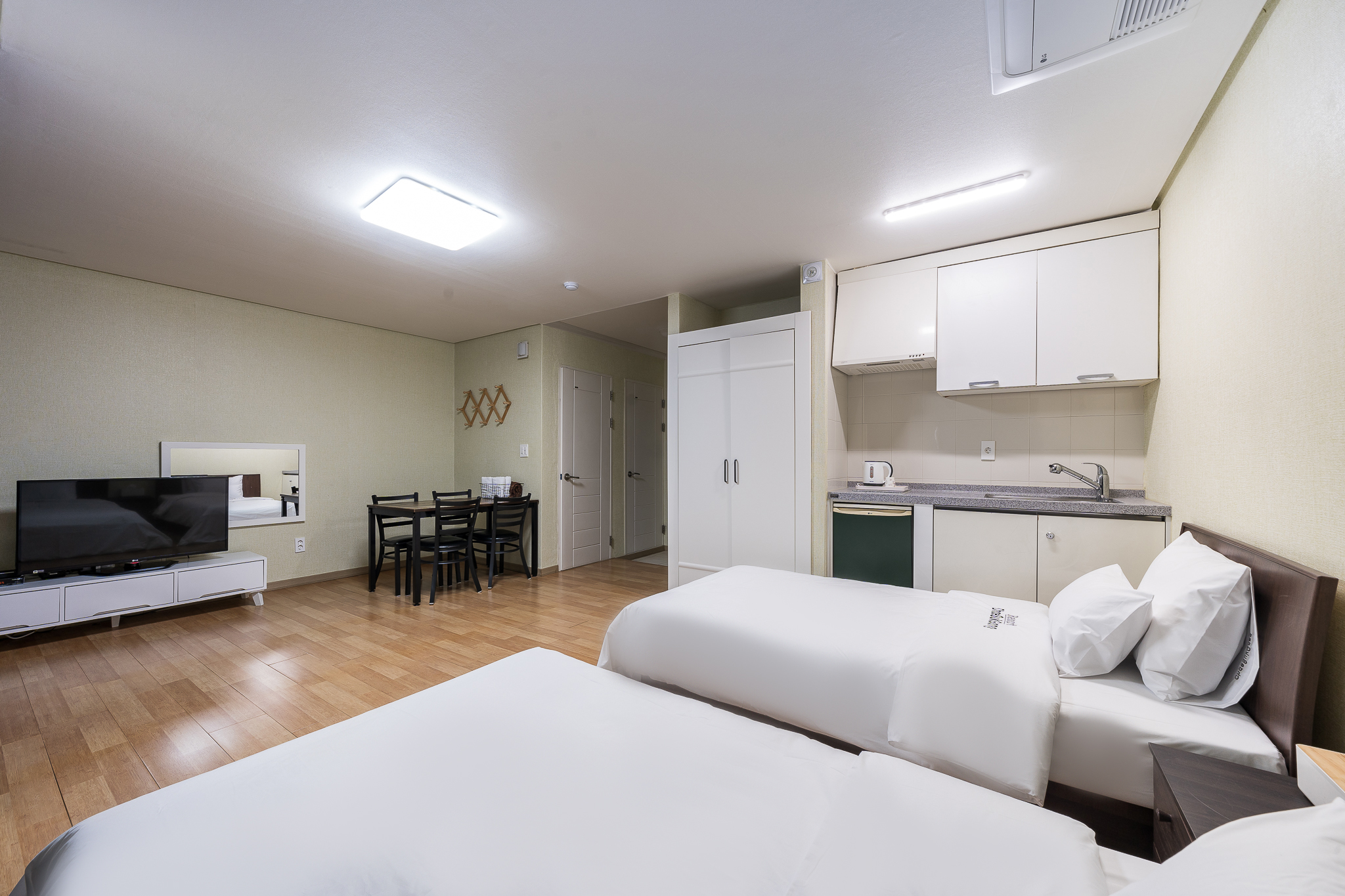 전기밥솥, 하이라이트 1구, 칼, 가위, 도마, 숟가락, 젓가락, 밥국그릇, 냄비, 접시, 후라이팬 등의 물품은 객실 내 구비되어 있으나 그 외 물품은 객실 내 구비되어 있지 않으니 이용 시 참고 부탁드립니다