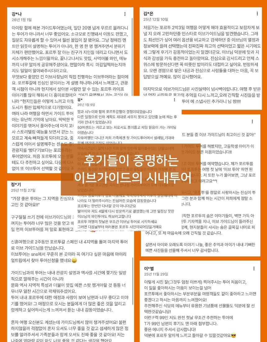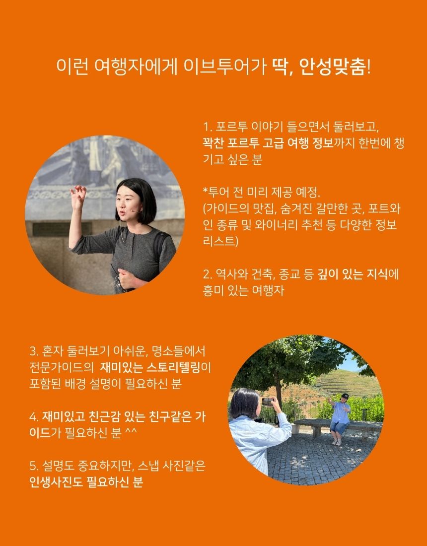 가이드님이 포르투갈, 특히 포르투에서 직접 살면서 느꼈던 선물 같은 풍경과 생생한 현지 분위기를 함께 나누는 투어예요. 따뜻하고 친절한 현지인들, 맛있는 음식과 와인, 숨겨진 아름다운 풍경까지, 기대 이상의 큰 매력을 느낄 수 있도록 도와드려요. 크리스마스 이브(Eve)처럼 설레는 여행, 잊지 못할 특별한 순간을 선물해 드릴게요. 최소 인원 2명만 모여도 출발하여 취소 확률이 매우 낮다는 것이 장점이에요. 가이드 인증 명소들만 알짜배기로 방문할 수 있으니 분명 만족도가 높을 거예요. 또한 사진에 진심인 가이드님과 함께 예쁜 여행 사진 남겨 보세요.