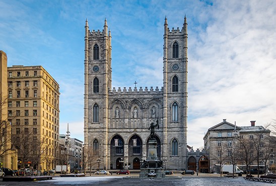 노틀담 광장: 몬트리올 노틀담 성당이 자리한 역사적인 광장이에요.