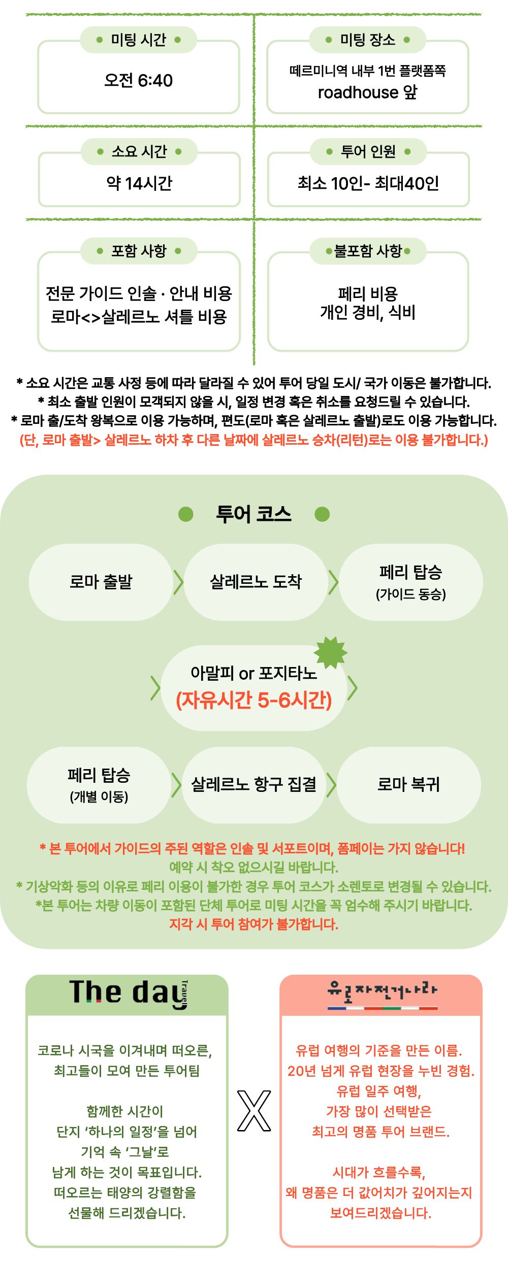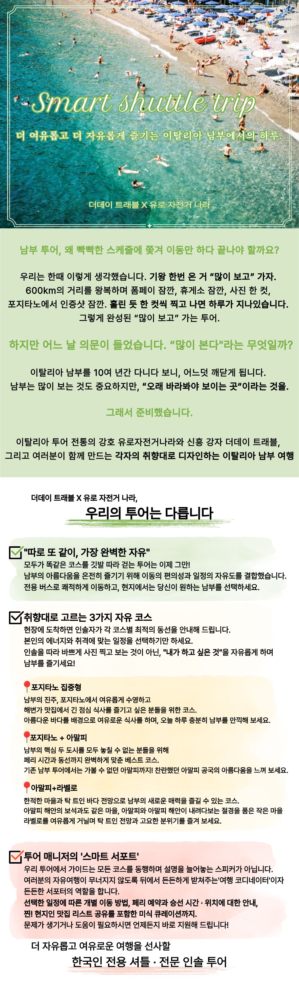 폼페이를 가지 않는 대신 남부에서 자유시간을 길게 드리고 아말피 또는 포지타노에서 5~6시간의 넉넉한 자유시간을 드려요. 추천해드리는 3가지 코스 중 원하는 동선을 선택해 개별적으로 둘러볼 수 있는 점이 가장 큰 매력이에요. 살레르노까지 이동 후 페리를 타고 해안을 따라 들어가기 때문에, 바다 위에서 감상하는 아말피 해안의 절경까지 함께 경험할 수 있어요. 가이드는 전 일정 설명 위주가 아닌 인솔과 안내 역할을 맡아 이동을 도와드리고, 맛집 추천과 동선 안내 등 실질적인 정보는 충분히 제공해드려 자유여행의 장점은 살리고 부담은 줄여드려요. 하루 14시간 동안 알차게 남부 이탈리아를 경험하고 저녁에 로마로 복귀하는 효율적인 일정이에요.