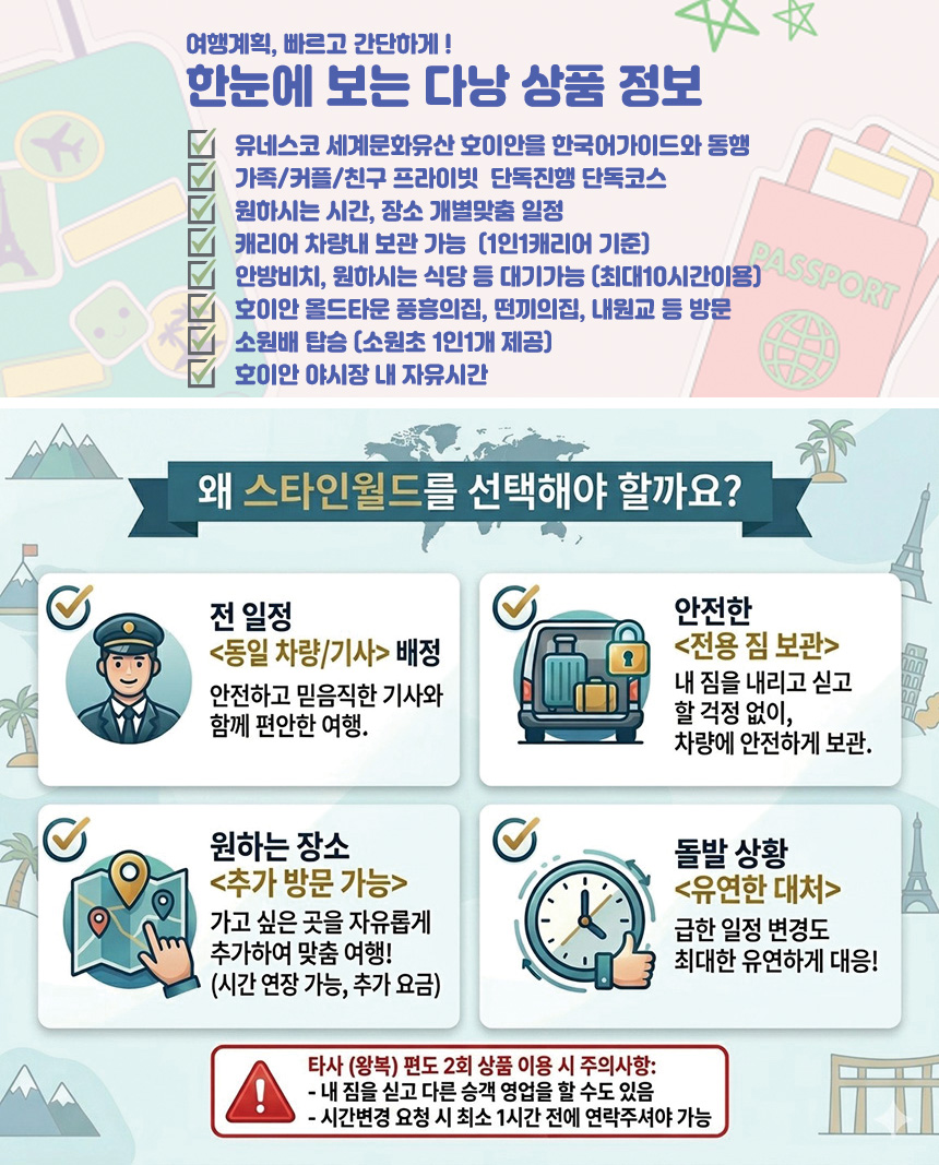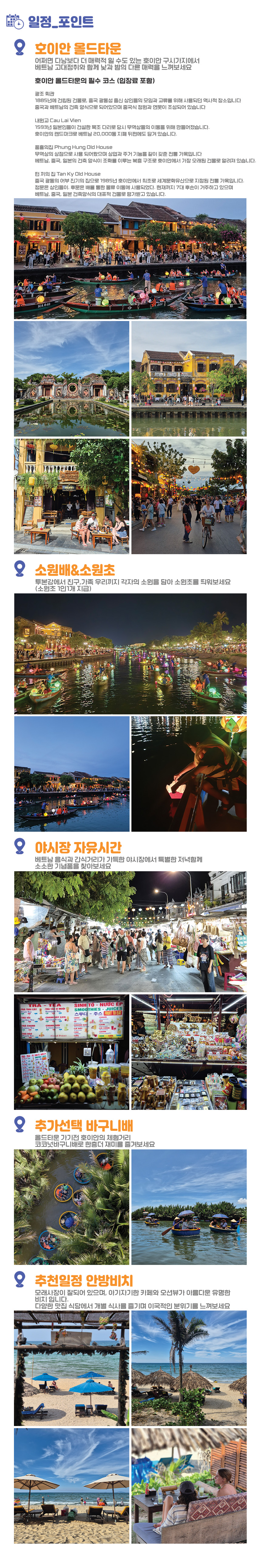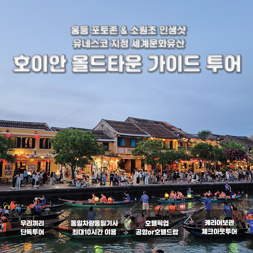 호텔 픽업으로 편안하게 여정을 시작하여 전문가의 설명과 함께 역사적인 고택들을 방문하고, 해가 지면 야시장의 활기와 소원배의 낭만까지 한 번에 경험할 수 있습니다. 안방비치나 바구니배 체험이 포함된 옵션을 선택해 더욱 다채로운 호이안의 얼굴을 마주해보세요.