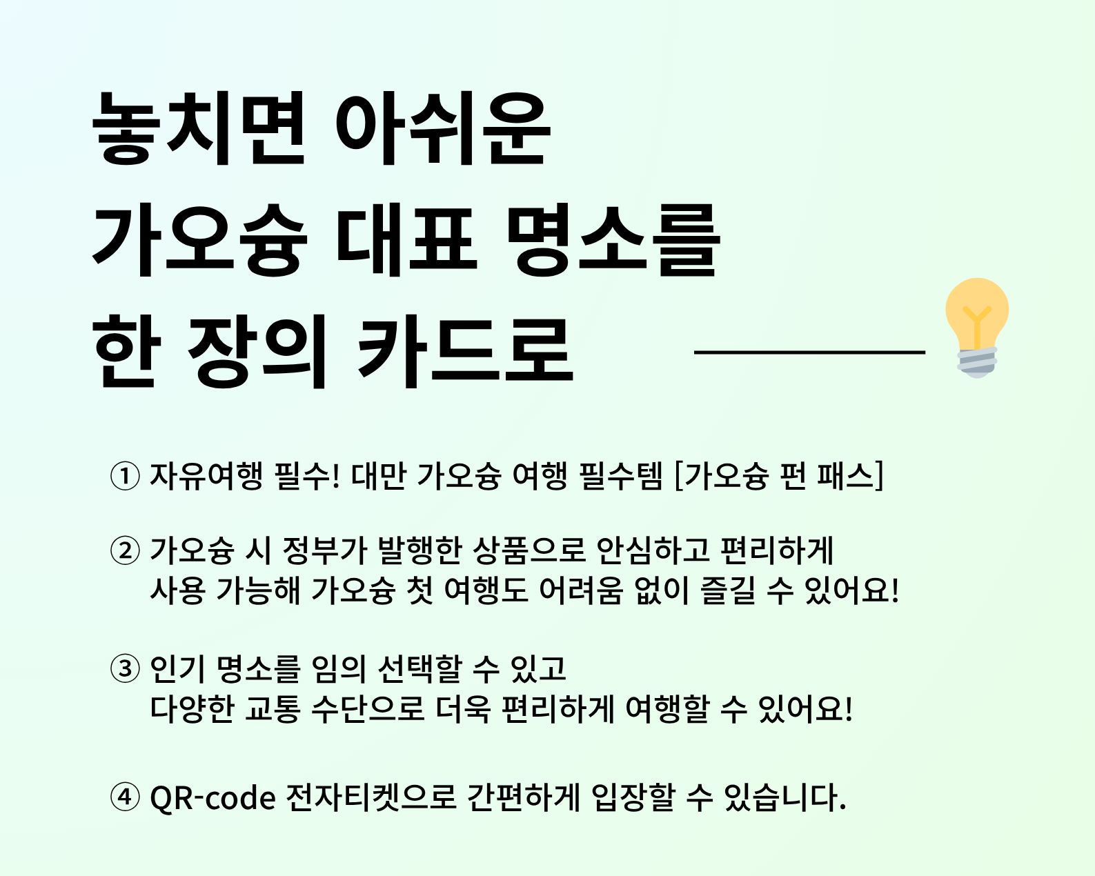 복잡한 교통권 구입과 입장권 예매 고민 없이, 스마트폰 하나로 가오슝의 구석구석을 자유롭게 누벼보세요. MRT와 LRT를 활용한 효율적인 이동은 물론, 현지의 핫플레이스와 맛집 혜택까지 알차게 담아냈습니다. 대기 시간은 줄이고 여행의 설렘은 채우고 싶은 여행자들을 위해 준비한 가오슝 여행의 필수 아이템입니다. 낯선 도시에서 노선을 확인하고 잔돈을 준비하는 번거로움 대신, 스마트폰 속 QR 코드 하나로 가오슝의 대중교통과 주요 명소를 가볍게 터치해 보세요. 지하철역부터 낭만적인 트램, 그리고 도시를 가로지르는 버스까지 여행자의 동선에 제약을 없앴습니다.