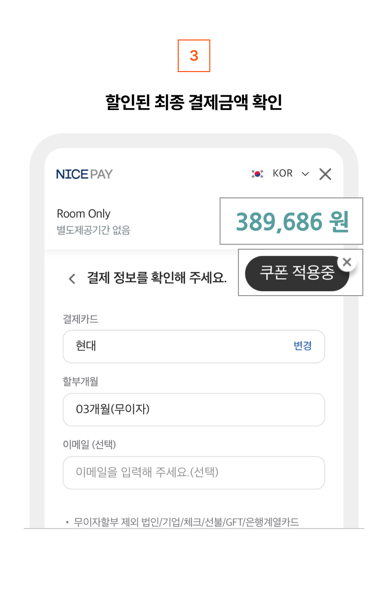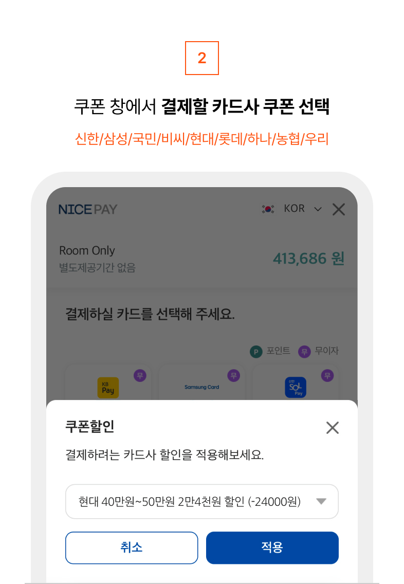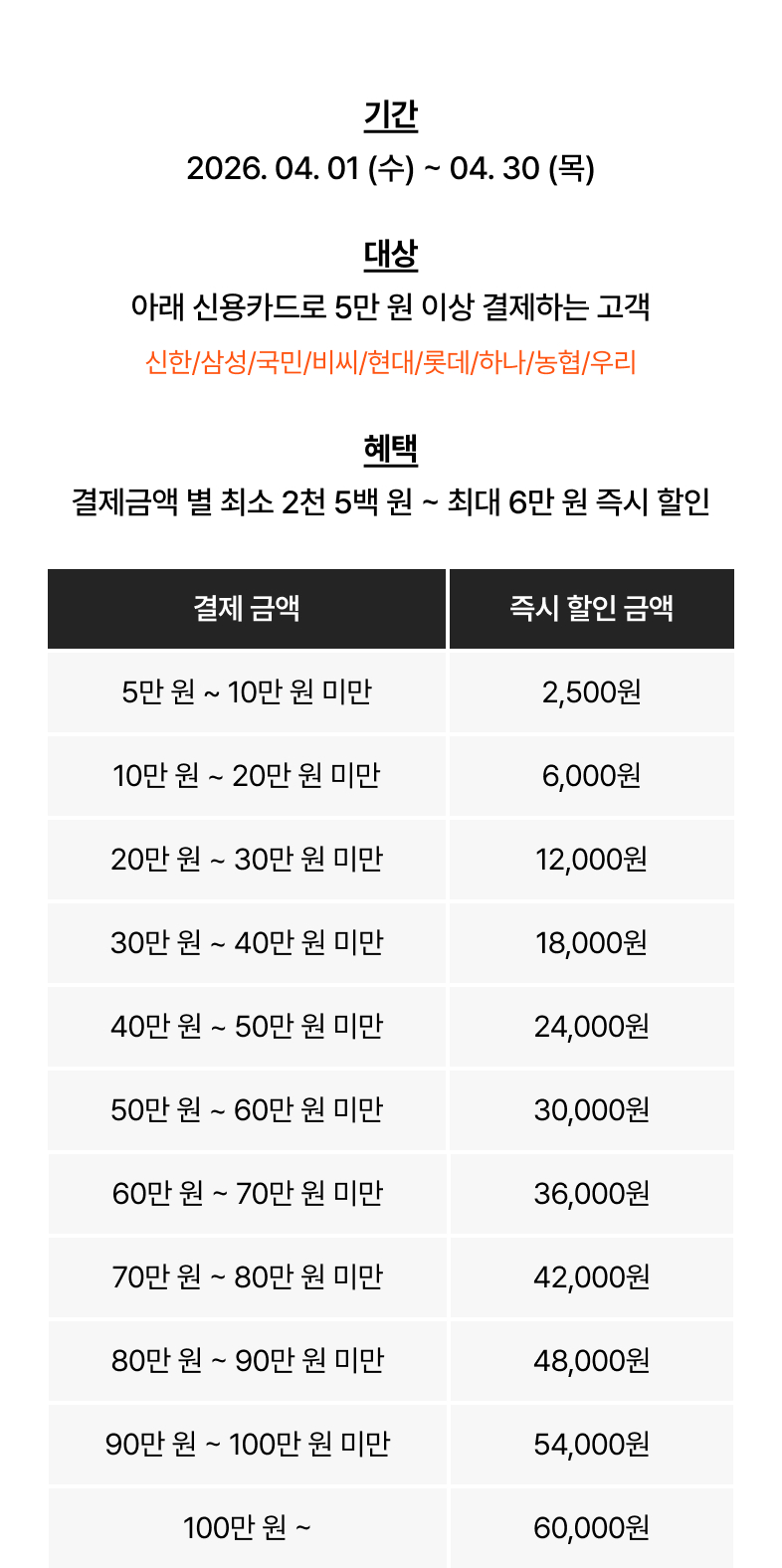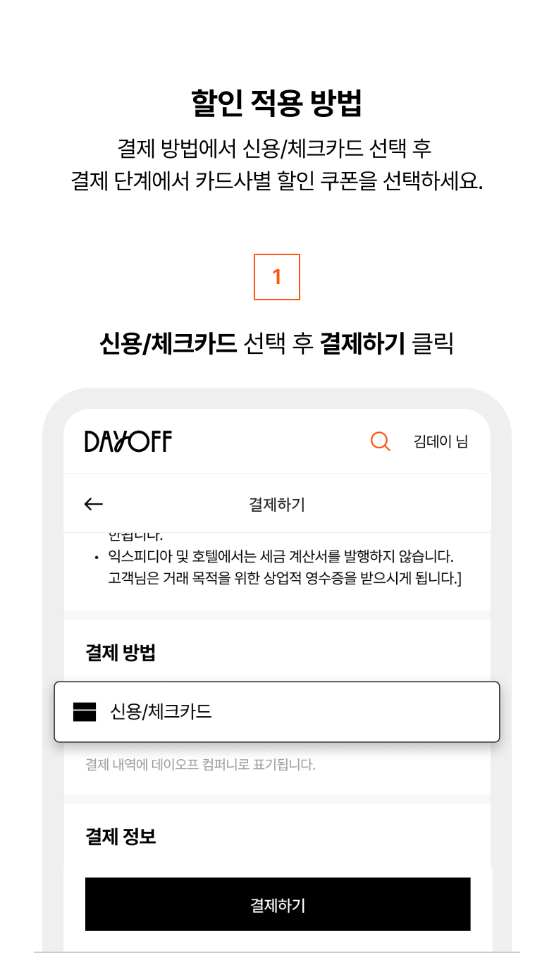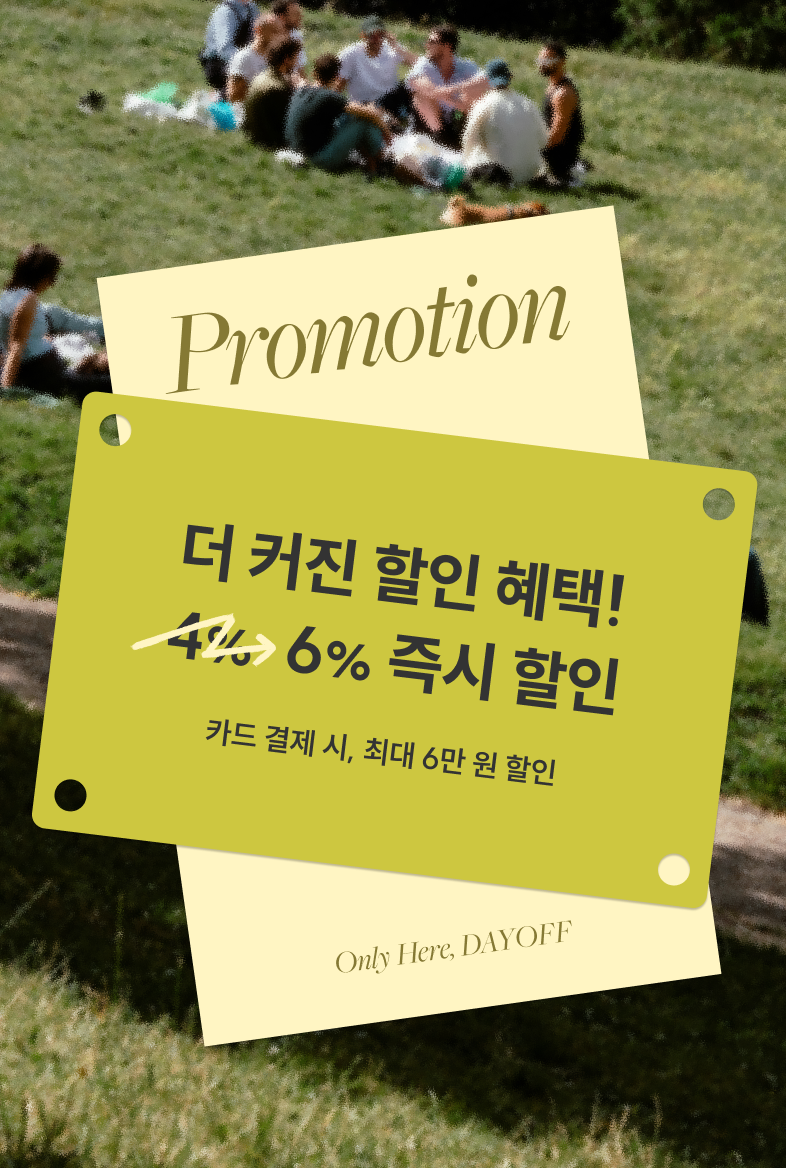 · 데이오프 가입 회원을 대상으로 선착순 한정 수량으로 진행되는 할인 이벤트입니다. · 쿠폰 수량이 모두 소진되거나, 데이오프 및 카드사의 사정에 따라 조기 종료될 수 있습니다. · [결제하기] 페이지에서 [결제하기] 버튼을 누른 후 약관 동의를 체크하면 쿠폰 할인 안내창이 노출됩니다. · 결제 화면에 쿠폰 할인 안내창이 뜨지 않는다면, 할인 조건에 해당되지 않거나 행사가 종료된 것입니다. · 쿠폰 할인 안내창에서 결제할 카드사의 쿠폰을 직접 선택하고, 해당 카드로 결제해야 할인이 적용됩니다. 할인 적용되는 신용카드는 신한/삼성/국민/비씨/현대/롯데/하나/농협/우리 카드입니다. · 나이스페이 결제 창에서 할인 쿠폰이 적용된 최종 결제금액을 꼭 확인하세요. · 관련 문의는 데이오프 고객지원팀(help@dayoff.co.kr)으로 부탁드립니다.