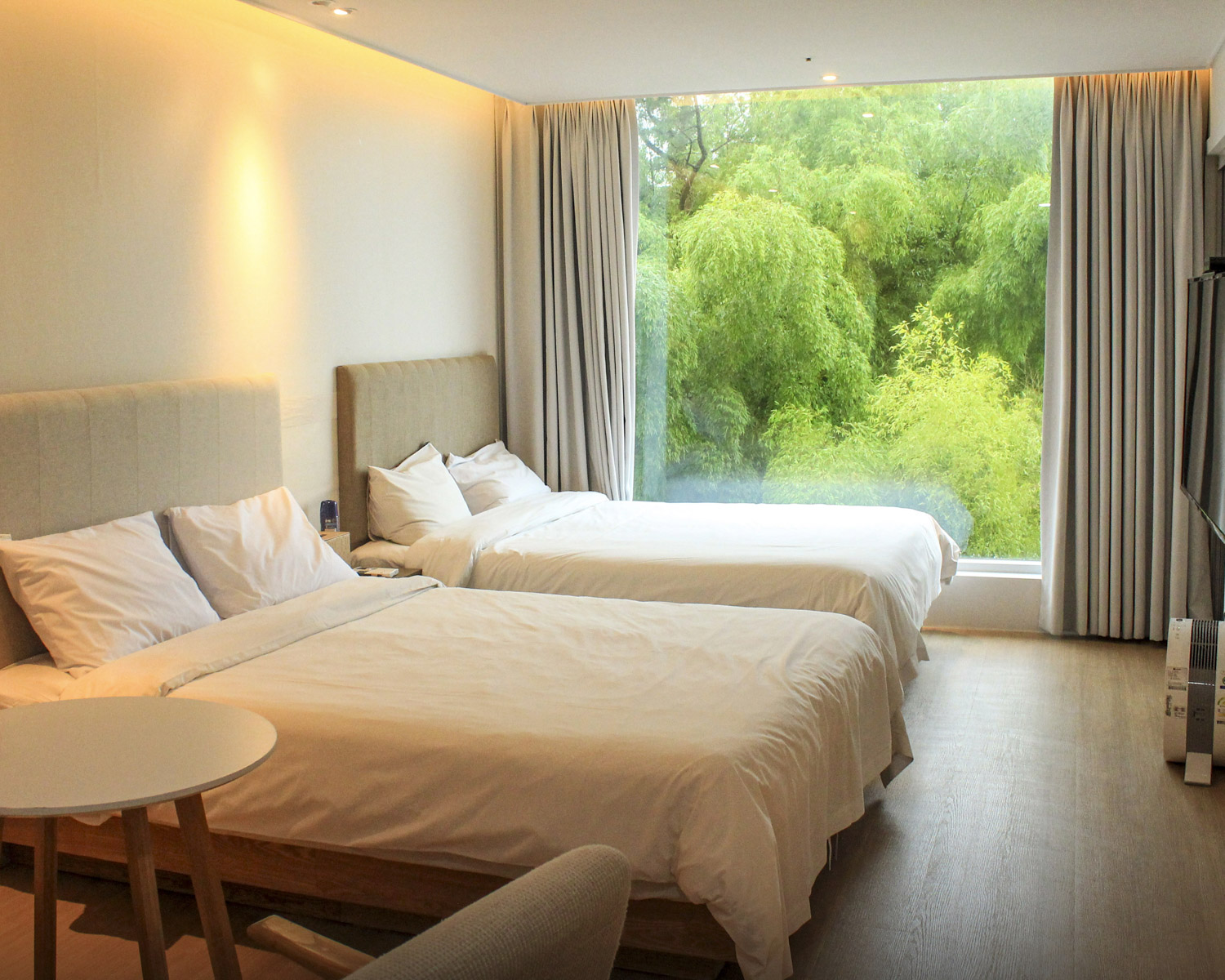 이곳의 매력은 노을지는 해안선을 만끽할 수 있는 풀장! 겨울에 묵었음에도 적당히 따듯한 물 온도 덕분에 친구들과 수영을 즐길 수 있었어요. 게다가 풀장 한 켠에 사우나실이 있어서, 수영 중간 잠시 쉬며 몸을 데울 수 있었고요! 객실은 딱 깔끔하고 편안했고, 창문으로 바라보는 바다뷰가 멋졌습니다.