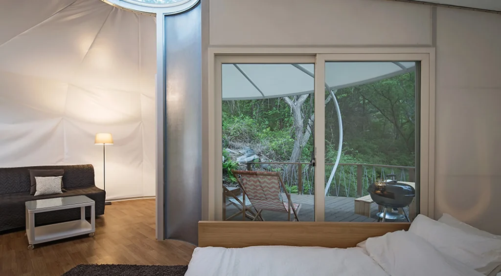 가평 글램핑장 중에서도 독특한 매력을 지닌 곳은 온더락 캠핑입니다. 아침고요수목원으로 이어지는 길목의 높은 숲속에 자리하고 있어 탁 트인 전망과 맑은 공기를 한껏 느낄 수 있습니다. 전나무 숲에 둘러싸인 이곳의 글램핑 텐트는 마치 호텔 객실처럼 깔끔하고 세련된 감성을 지니고 있어, 조용하고 품격 있는 휴식을 원하는 분들께 잘 어울립니다.
