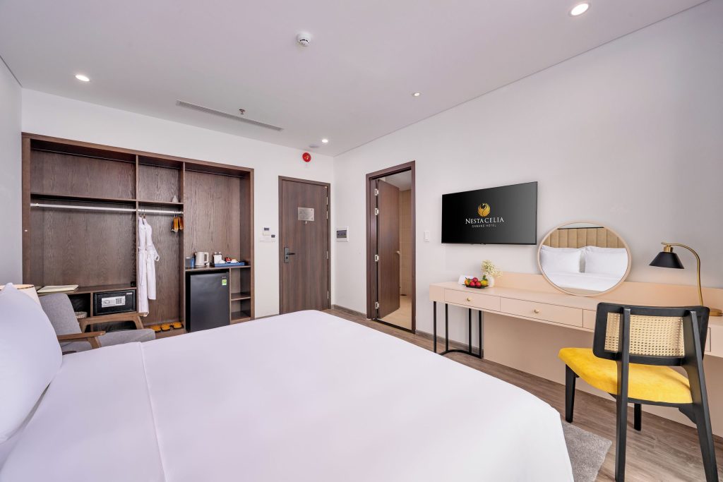 2인여행하기 좋은 네스타셀리아다낭호텔의 추천 객실은 ‘프리미어 더블룸’ 입니다. 킹사이즈침대 1개가 준비된 34 제곱미터 크기의 객실로 바다 전망의 발코니도 준비되어 있습니다. 최대 성인 3명, 아동 2명이 투숙 가능한 객실로 무선 인터넷 사용과 전용 욕실을 이용해 편하게 머물기 좋습니다. 객실엔 에어컨, TV, 책상, 미니바, 헤어드라이어 등이 준비되어 있고 매일 하우스키핑 서비스를 제공해 쾌적한 환경에서 여행의 피로를 풀기 좋습니다.