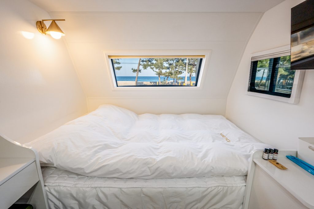 모든 객실에서 동해바다를 볼 수 있는 오션뷰카라반 올덴리조트카라반은 약 6평의 카라반입니다. 기준 인원 2인, 최대 인원 4인 객실로 사용할 카라반은 체크인 시 현장 랜덤 배정 규칙을 따릅니다. 넓은 실내 공간을 갖췄으며 개별 테라스에서 온천수를 이용한 개인 자쿠지를 이용할 수 있습니다. 원룸형 객실엔 더블침대 1개, 2층 침대가 있으며 개별 바비큐장과 개인 자쿠지가 포함됩니다. 어메니티와 TV, 전자레인지, 인덕션, 취사도구, 냉난방기, 냉장고 등의 시설이 잘 갖춰져 있습니다.